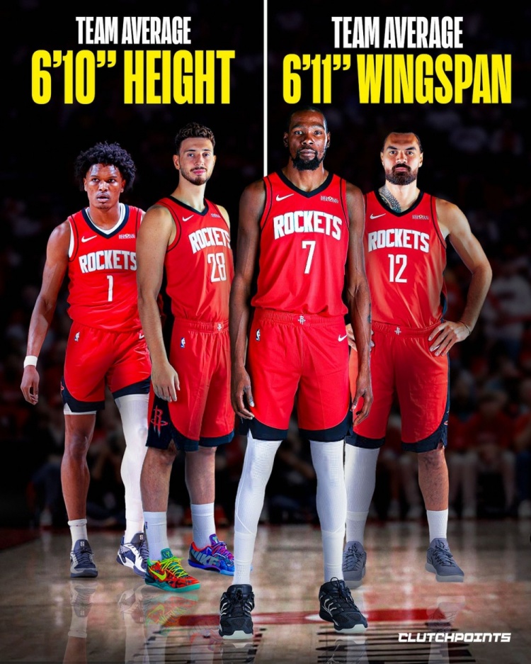 10月13日訊 Clutch Points報道,根據(jù)官方數(shù)據(jù)信息,火箭全隊平均身高達2米08(6尺10),全隊平均臂長2米11(6尺11.2),相比聯(lián)盟平均的平均臂展2米08(6尺10)還要更長。除了身高、臂展,火箭全隊平均體重約109公斤(241磅),同樣讓他們比他們將面對的大多數(shù)對手都更重、更硬。