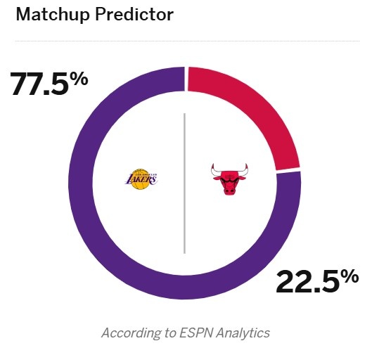 今天,ESPN預(yù)測本場比賽勝率,湖人77.5%,公牛22.5%。