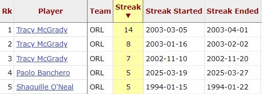 而魔術(shù)整個(gè)隊(duì)史上,而僅麥迪、奧尼爾和班凱羅三人能連續(xù)5場(chǎng)30+。