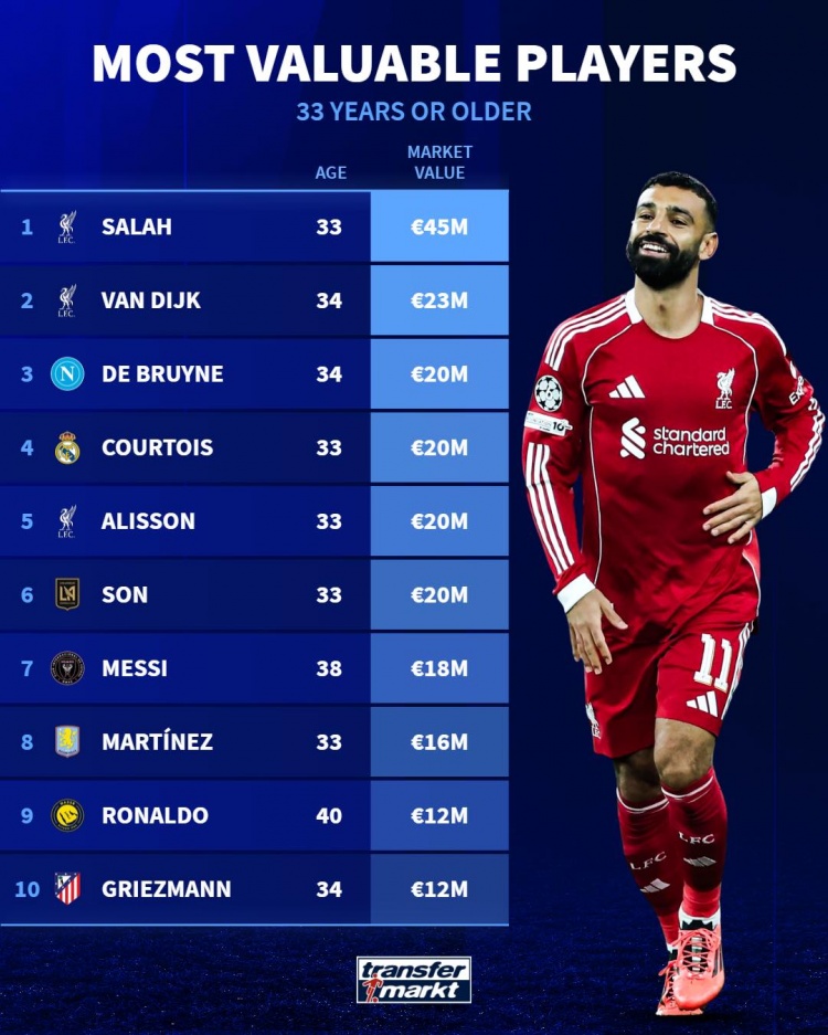12月7日訊 德國(guó)轉(zhuǎn)會(huì)市場(chǎng)統(tǒng)計(jì)了年齡33+球員的身價(jià),并列出榜單,薩拉赫4500萬歐居首,梅西1800萬歐第七。