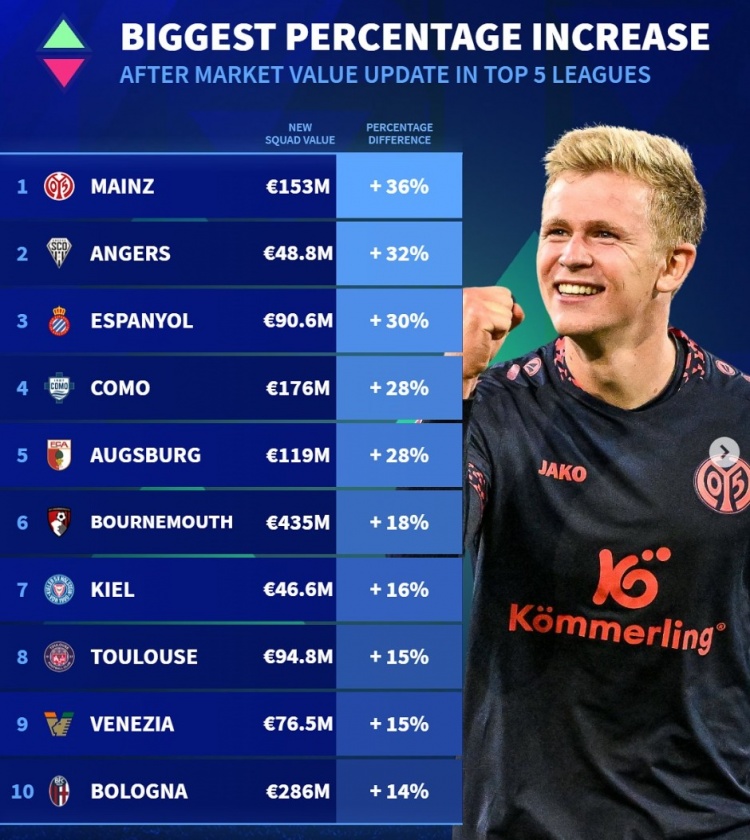五大聯(lián)賽球隊身價升值比例最高榜:歐元