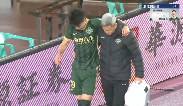 隨后隊(duì)醫(yī)進(jìn)場(chǎng)簡(jiǎn)單治療,擔(dān)架進(jìn)場(chǎng)將王鈺棟抬離球場(chǎng)。最終王鈺棟無(wú)法堅(jiān)持,被姚均晟換下。